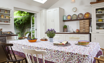 There tend to be three different types of provençal tablecloths. Firstly, what the French call “allover” – which involves a small pattern repeated across the tablecloth. This can be the omnipresent “cigale” or cicada that is traditionally used decoratively on pottery and glassware in Provence. Or it can be olives, lemons or a simple geometric design. The second style of provençal tablecloth is a linear pattern. The overall effect is slightly striped. Different patterns in contrasting colours are seen side by side along the length of the tablecloth. The effect is very striking and can transform a kitchen, instantly bringing the warm colours of Provence into the home. “Allover” and linear tablecloths usually come in coated and uncoated versions. Now – for the uninitiated – a word about coated tablecloths. These are a fabulous invention – the cotton fabric is treated with a Teflon or acrylic coating which makes the tablecloth stain repellent. It’s like magic – the spillage simply wipes off. This makes this type of provençal tablecloth absolutely ideal for high traffic areas such as the kitchen. The great thing about this coating is that although there is a light sheen to the tablecloth, because the tablecloth itself is made of cotton (and not plastic or oilcloth) the tablecloth drapes properly at the corners and it doesn’t stick out at awkward angles.