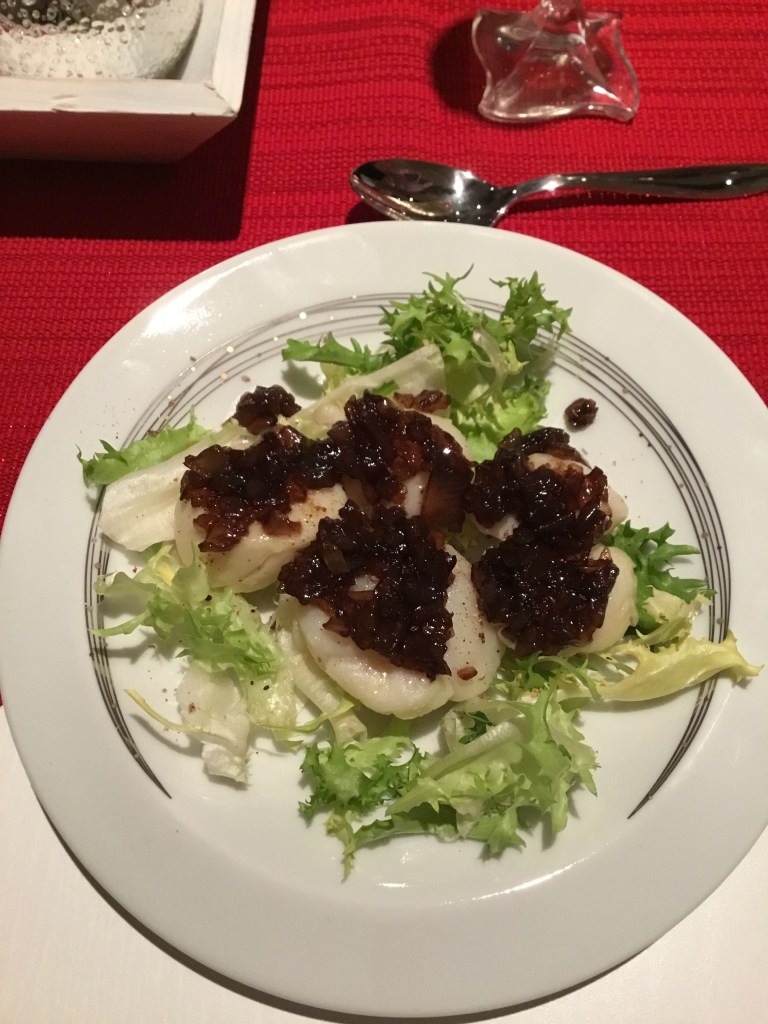 Our New Year’s Eve entree, scallops with balsamic-carmelized onions.