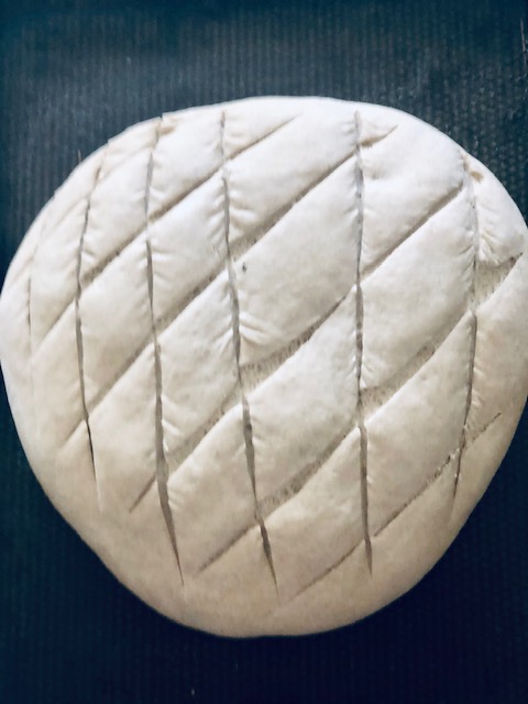 With a sharpened knife, make several crisscrossing lines across the top and dust with flour.