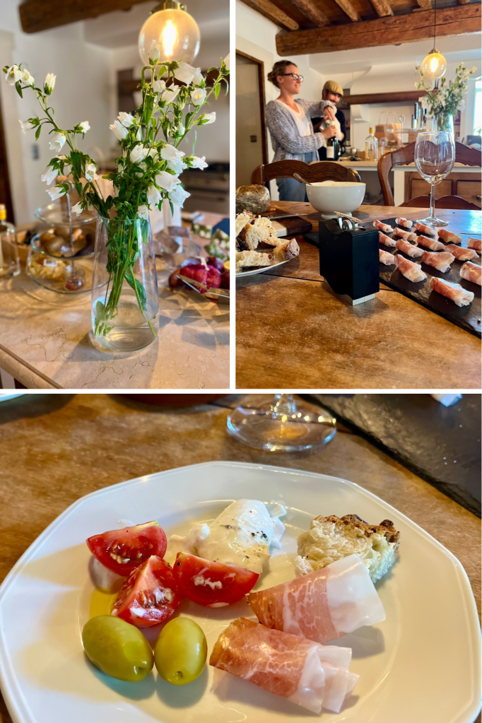 Before heading out to a fantastic tapas restaurant (Edu) in Saint Rémy de Provence (a recommendation from our hosts!), we were treated by Charline and Ronald to a lovely aperitif of local wine, pâte, olives, cured ham, and a thick slab of creamy mozzarella adorned with cherry tomatoes – served with crusty bread and drizzled with the Mas’ own olive oil. Superb!